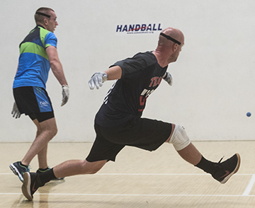 MINNEAPOLIS, Minn. — The quarterfinals of the Men’s Open singles brought incredible drama to 2018 World Championships and USHA Four-Wall Nationals. Team USA’s Sean Lenning (pictured stretching for a return) pushed Ireland’s Robbie McCarthy to a 19-19 tie in the first game, but the lengthy American ultimately couldn’t break through, falling 21-19, 21-14.