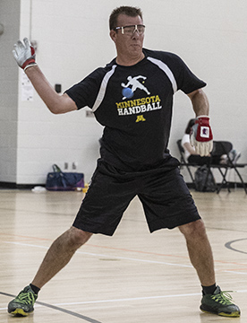 MINNEAPOLIS, Minn. — Minnesota’s own Mike Gustafson brought the first 2018 World Title to his home state by winning the Masters Singles 1-Wall Small Ball title over Ireland’s James Doyle on Saturday, 21-13, 12-0 injury default. What started as a spirited match, ended anticlimactically with Doyle’s injury default.