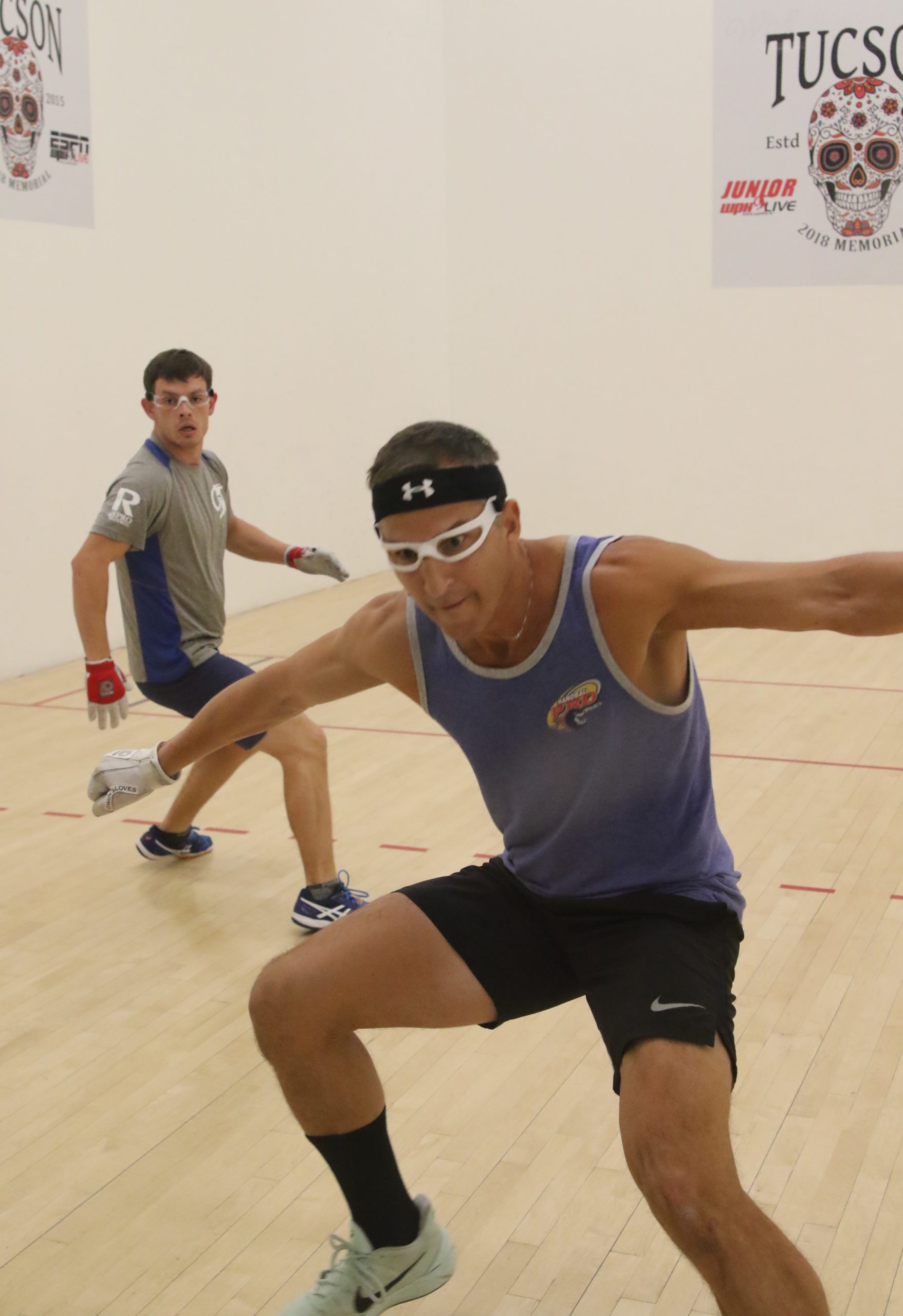 Richie Fernandez (background) waits for Daniel Cordova to track down a ball off the back wall in first round action in the WPH R48Pro Draw. Cordova advanced to the quarterfinals by defeating Fernandez, 15-6, 15-3.