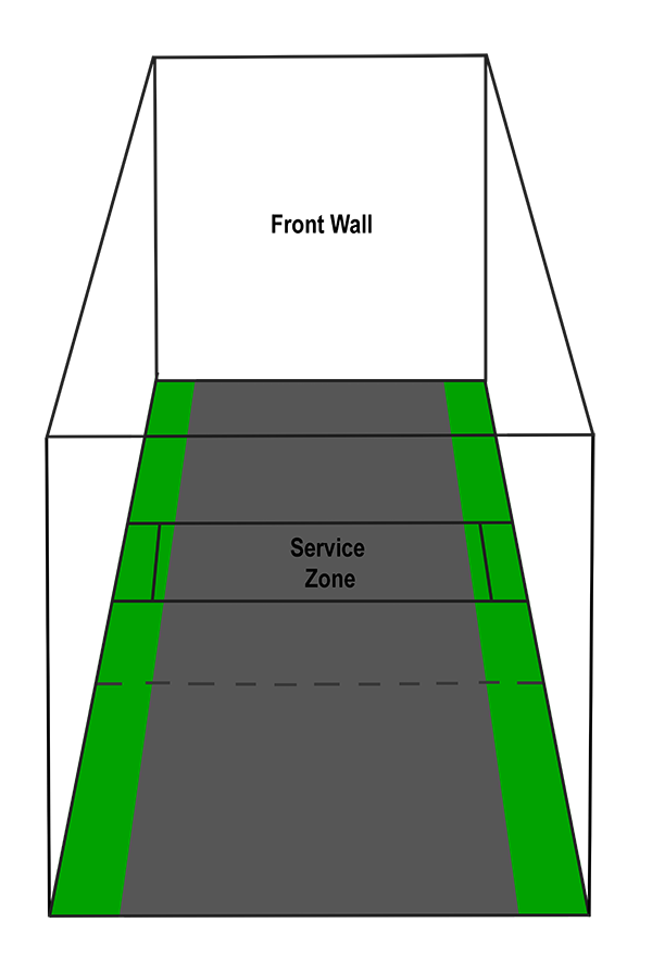 The one-wall server is dealing with a short line much closer to the wall than in three- and four-wall, 16 feet as opposed to 20 feet. As he faces the wall, the one-wall server has the short line in front of him, whereas the three- or four-waller has the short line behind him.