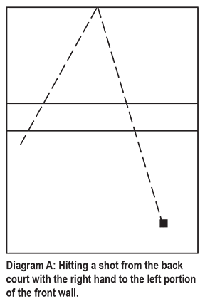 Diagram A: Illustrates a shot taken near the right side wall that requires the use of the right hand. The ball should be directed to the front wall, left of center, 4 to 6 feet high, with power and at an angle that allows the ball to contact the side wall near the short line.