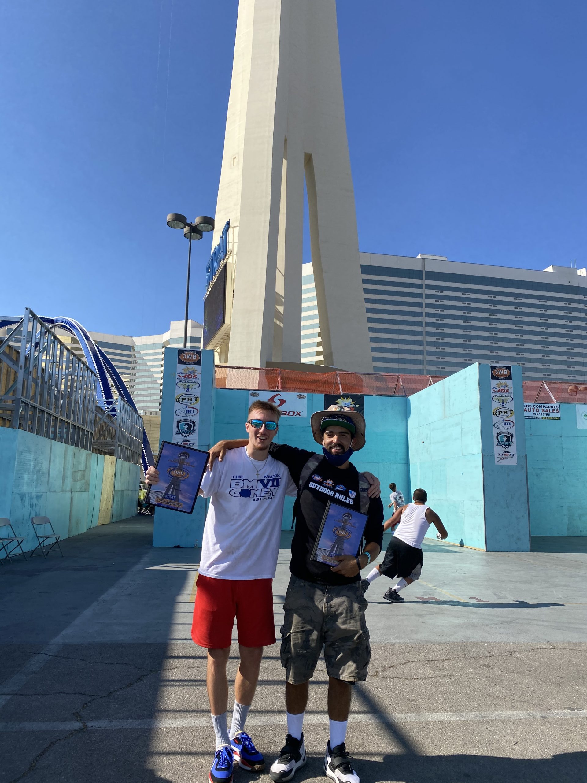 DAY 1 (10/16/20) – LAS VEGAS — The 3 WallBall World Handball Championships kicked off today in Las Vegas at 9:30 am across the street from the stratosphere hotel. It was a long day at the courts, with the final games finishing up just after midnight. A limited capacity of fans were allowed in to watch, and everyone not playing had to social distance and wear a mask.