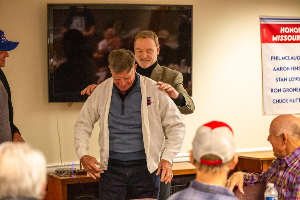 USHA President Denis Hogan presented the sweater to San Angelo, who shared with those gathered, “This journey started 19 years ago. It’s tough but glad players have a goal to chase.” San Angelo will be playing for title number 11 on Sunday with partner Bob Braine.
