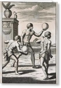 Meanwhile, back in Europe the Greek writer Homer refers to a handball game invented by Anagalla, a princess of Sparta, and describes the action in a picturesque, if not very informative way, “O’er the green mead the sporting virgins play, their shining veils unbound along the skies, tossed and retossed, the ball incessant flies.” In Ireland a good server of the ball is said to have a great toss!