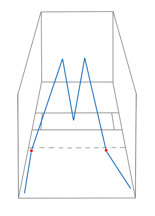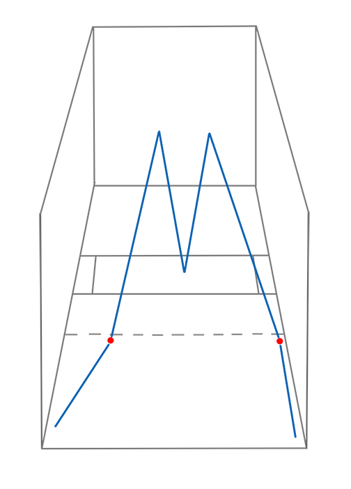 Now consider the rules of the game. They simply state that you must return the ball before it bounces twice on the floor. Even the best kill-shot artists rarely hit their shots so low that they bounce twice before reaching the service line. Thus, we’ve dramatically lessened the amount of floor space we’ll need to cover. Since we’ll never have to protect the portion of the court very near the front wall, we can take another step back from the physical center for our center-court position in terms of reaction time.