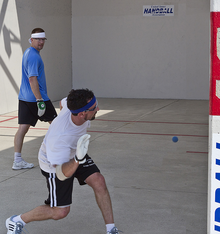 ![]() From the 2013 One-Wall Open final: Tyree Bastidas and Joe Kaplan are two champions who leave everything on the court. Photo by Keith Thode. |